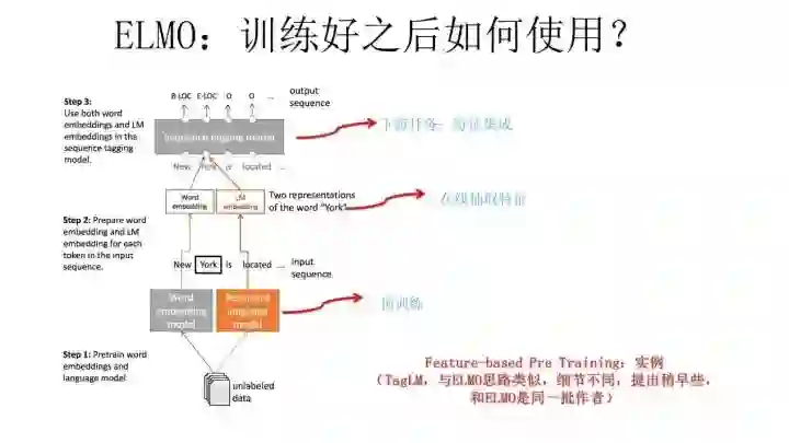 上面这个图是TagLM采用类似ELMO的思路做命名实体识别任务的过程,其步骤基本如上述ELMO的思路,所以此处不展开说了。TagLM的论文发表在2017年的ACL会议上,作者就是AllenAI里做ELMO的那些人,所以可以将TagLM看做ELMO的一个前导工作。前几天这个PPT发出去后有人质疑说FastAI的在18年4月提出的ULMFiT才是抛弃传统Word Embedding引入新模式的开山之作,我深不以为然。首先TagLM出现的更早而且模式基本就是ELMO的思路;另外ULMFiT使用的是三阶段模式,在通用语言模型训练之后,加入了一个领域语言模型预训练过程,而且论文重点工作在这块,方法还相对比较繁杂,这并不是一个特别好的主意,因为领域语言模型的限制是它的规模往往不可能特别大,精力放在这里不太合适,放在通用语言模型上感觉更合理;再者,尽管ULFMiT实验做了6个任务,但是都集中在分类问题相对比较窄,不如ELMO验证的问题领域广,我觉得这就是因为第二步那个领域语言模型带来的限制。所以综合看,尽管ULFMiT也是个不错的工作,但是重要性跟ELMO比还是差一档,当然这是我个人看法。