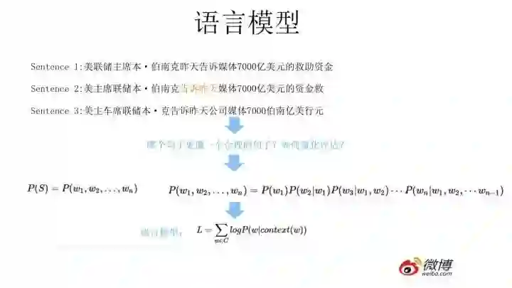 什么是语言模型?其实看上面这张PPT上扣下来的图就明白了,为了能够量化地衡量哪个句子更像一句人话,可以设计如上图所示函数,核心函数P的思想是根据句子里面前面的一系列前导单词预测后面跟哪个单词的概率大小(理论上除了上文之外,也可以引入单词的下文联合起来预测单词出现概率)。句子里面每个单词都有个根据上文预测自己的过程,把所有这些单词的产生概率乘起来,数值越大代表这越像一句人话。语言模型压下暂且不表,我隐约预感到我这么讲你可能还是不太会明白,但是大概这个意思,不懂的可以去网上找,资料多得一样地汗牛冲动。