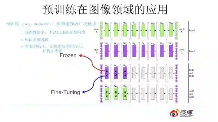 那么图像领域怎么做预训练呢,上图展示了这个过程,我们设计好网络结构以后,对于图像来说一般是CNN的多层叠加网络结构,可以先用某个训练集合比如训练集合A或者训练集合B对这个网络进行预先训练,在A任务上或者B任务上学会网络参数,然后存起来以备后用。假设我们面临第三个任务C,网络结构采取相同的网络结构,在比较浅的几层CNN结构,网络参数初始化的时候可以加载A任务或者B任务学习好的参数,其它CNN高层参数仍然随机初始化。之后我们用C任务的训练数据来训练网络,此时有两种做法,一种是浅层加载的参数在训练C任务过程中不动,这种方法被称为“Frozen”;另外一种是底层网络参数尽管被初始化了,在C任务训练过程中仍然随着训练的进程不断改变,这种一般叫“Fine-Tuning”,顾名思义,就是更好地把参数进行调整使得更适应当前的C任务。一般图像或者视频领域要做预训练一般都这么做。