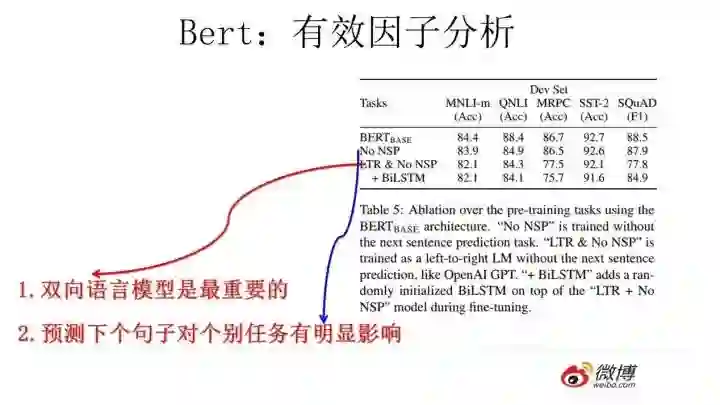 我们说过Bert效果特别好,那么到底是什么因素起作用呢?如上图所示,对比试验可以证明,跟GPT相比,双向语言模型起到了最主要的作用,对于那些需要看到下文的任务来说尤其如此。而预测下个句子来说对整体性能来说影响不算太大,跟具体任务关联度比较高。