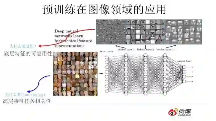 目前我们已经知道,对于层级的CNN结构来说,不同层级的神经元学习到了不同类型的图像特征,由底向上特征形成层级结构,如上图所示,如果我们手头是个人脸识别任务,训练好网络后,把每层神经元学习到的特征可视化肉眼看一看每层学到了啥特征,你会看到最底层的神经元学到的是线段等特征,图示的第二个隐层学到的是人脸五官的轮廓,第三层学到的是人脸的轮廓,通过三步形成了特征的层级结构,越是底层的特征越是所有不论什么领域的图像都会具备的比如边角线弧线等底层基础特征,越往上抽取出的特征越与手头任务相关。正因为此,所以预训练好的网络参数,尤其是底层的网络参数抽取出特征跟具体任务越无关,越具备任务的通用性,所以这是为何一般用底层预训练好的参数初始化新任务网络参数的原因。而高层特征跟任务关联较大,实际可以不用使用,或者采用Fine-tuning用新数据集合清洗掉高层无关的特征抽取器。