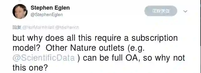 剑桥大学计算神经学家Stephen Eglen直接质疑《自然》顾左右而言他的回应,《自然》声称提供的服务和订阅模式并没有什么关系,自然的子刊《Scientific Data》就可以开放访问,为什么《机器智能》就不行?