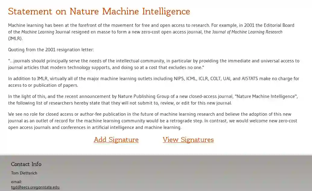 《自然》于2017年11月宣布,将于2019年发行新子刊《机器智能》(Nature Machine Intelligence)。然而,新子刊还没问世,就遭到了机器学习社区的阻击。今天,俄勒冈州立大学(Oregon State University)特聘教授Thomas G. Dietterich牵头起草了抵制《机器智能》的公开信,不到24小时,已有近千人签名,表示不会向《机器智能》投稿,不会为《机器智能》审稿,不会在《机器智能》担任编委。