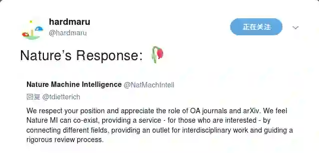 《自然》后来做出了回应,说了些不痛不痒的话,什么新子刊可以和开放的期刊、arXiv共存,可以提供严谨的审稿流程等等,促进不同学科间的交流。说得好像现在机器学习开放期刊和顶会没有严谨的审稿流程,不发表跨学科的论文似的。