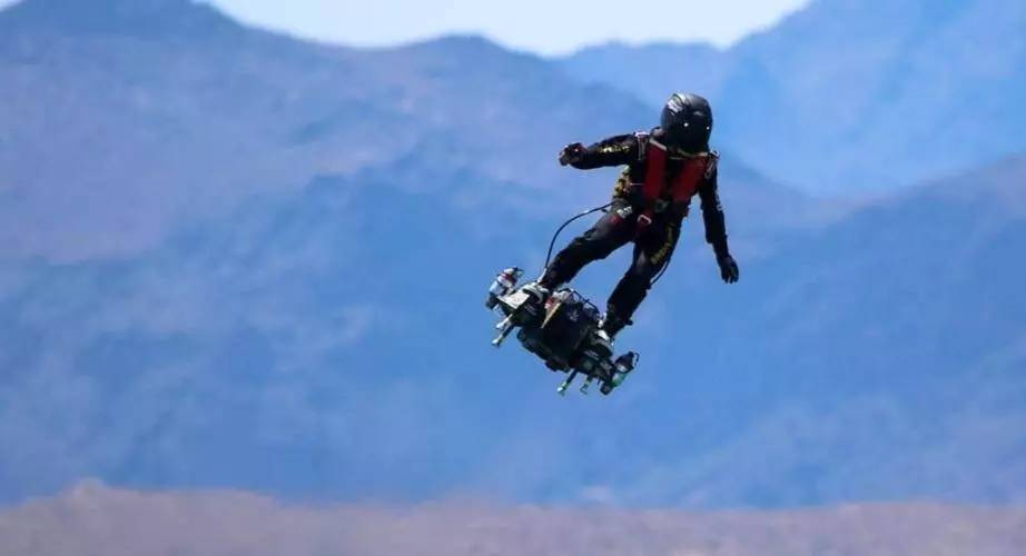 想飞天的人不止一个,Franky Zapata 创立的 Zapata Racing 致力于研究能实现单人飞行的「飞行器」,他们推出的 Flyboard 水上飞板借助水压的控制实现在海上飞行,最高可达 15 米。HOVERBOARD 更是将科幻电影《回到未来》中的悬浮滑板带进了现实。2016 年,Zapata Racing 团队 研发出 Flyboard Air 飞行悬浮滑板,借助喷气引擎将飞行场景由水上拓展到了空中,同时摆脱了底下限制距离的管子。没有地点和道具的限制,Flyboard Air 像极了《蜘蛛侠》中绿魔的飞行器。