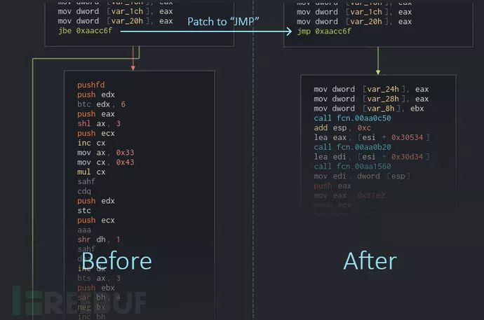 当满足这两个特征时,我们可以说第二个块很有可能是混淆块。在这种情况下,我们希望第一个块跳过第二个混淆块,这样混淆块就会从我们的逆向分析流程图中消失。这种情况下,我们可以用无条件跳转,也就是简单的JMP指令,来替换其中的条件跳转实现混淆块绕过。如下: