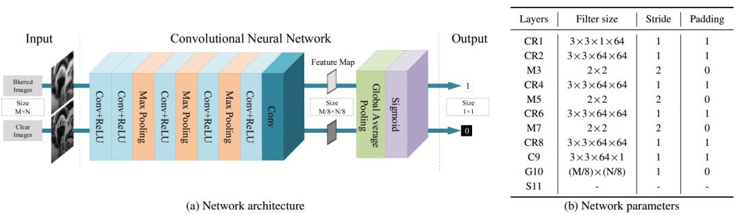 我们的目标是通过卷积神经网络来训练一个二分类器。这个网络以图像作为输入,并输出一个标量数值,这个数值代表的是输入图像是模糊图像的概率。因为我们的目标是将这个网络作为一种先验嵌入到由粗到精的 MAP(最大后验)框架中,所以这个网络应该具备处理不同大小输入图像的能力。所以,我们将分类其中常用的全连接层用全局平均池化层代替 [21]。全局平均池化层在 sigmoid 层之前将不同大小的特征图转换成一个固定的大小。此外,全局平均池化层中没有额外的参数,这样就消除了过拟合问题。图 2 展示了整个网络架构和二分类网络的细节参数。
