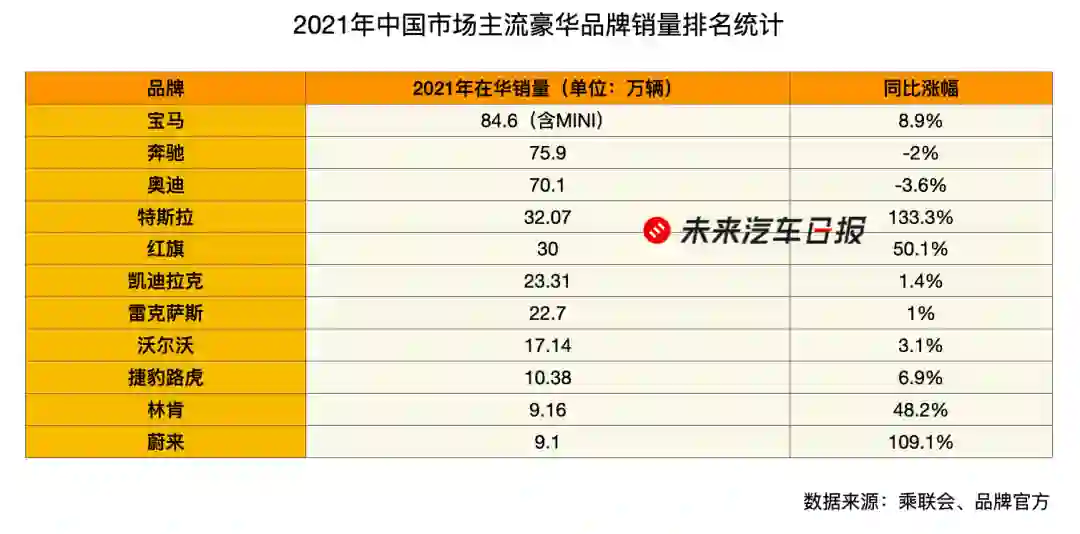 乘联会数据显示,2021年特斯拉在华年销量同比增长133.3%,至32.07万辆。这一数字仅次于BBA,超过雷克萨斯、凯迪拉克、捷豹路虎等二线传统豪华品牌。特斯拉不仅成功入围豪华品牌销量排名前五,增速也是最高的。