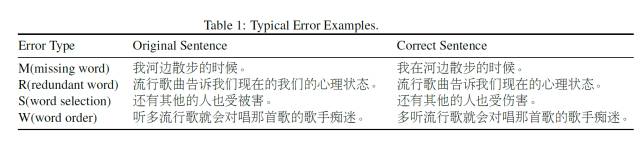 赛题中包含的错误分为四种类型:多词(Redundant)、缺词(Missing)、错词(Selection)和词序错误(Word Order)。系统性能的评估也由易到难分为3个level:detection level(识别句子有没有错误)、identification level(识别错误句子的具体错误类型)和position level(识别错误的位置和对应类型)