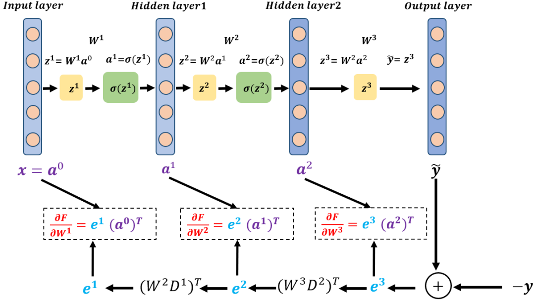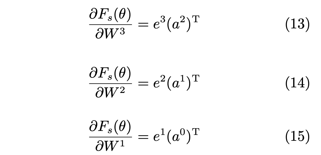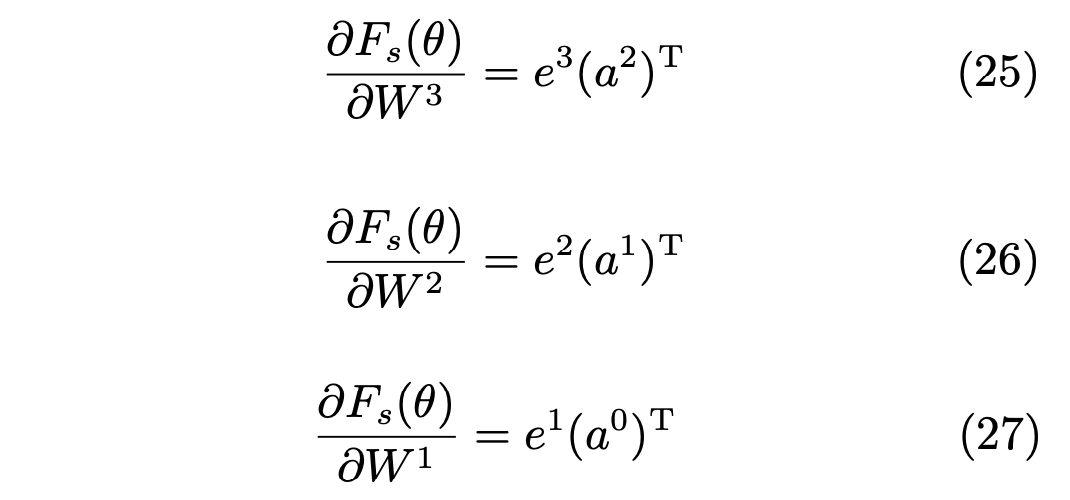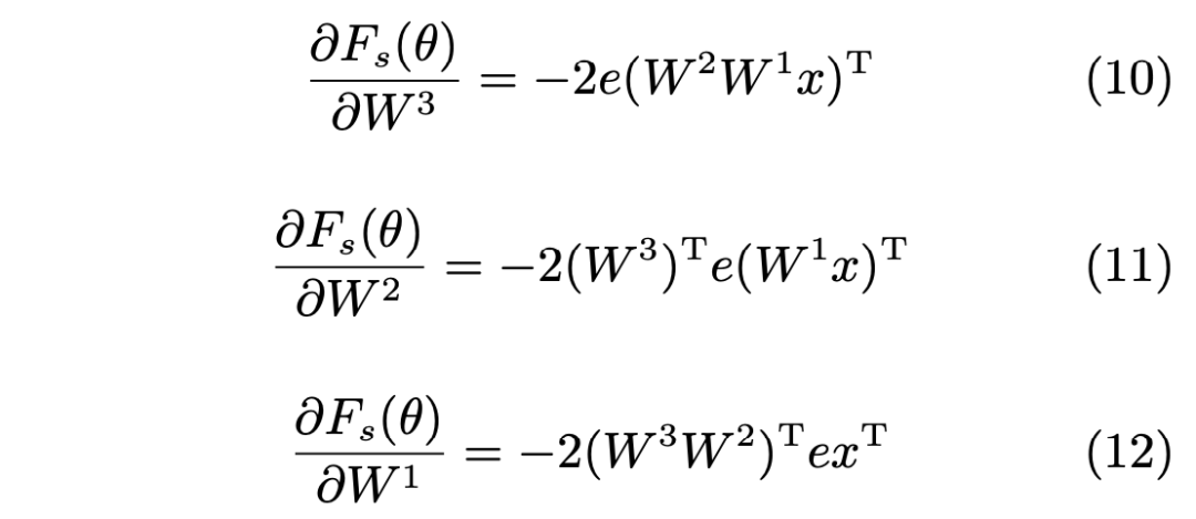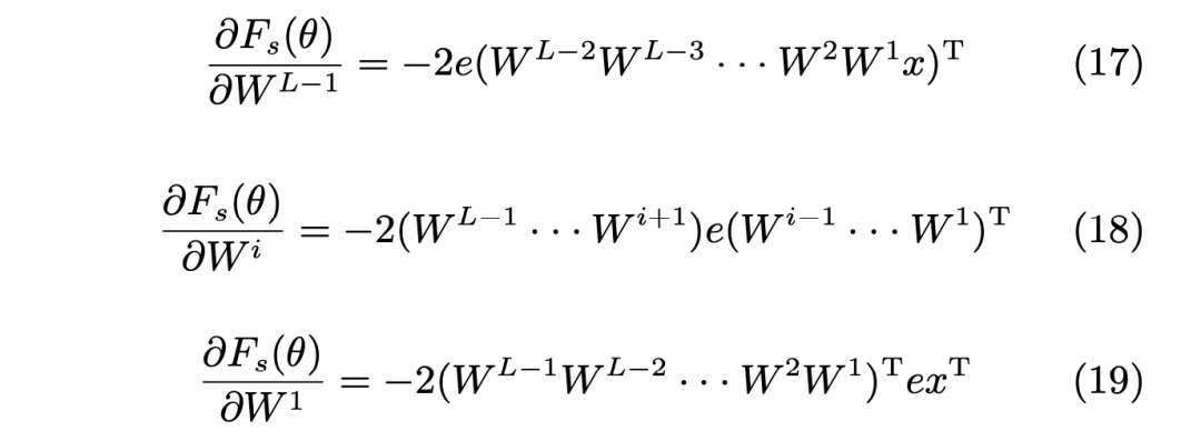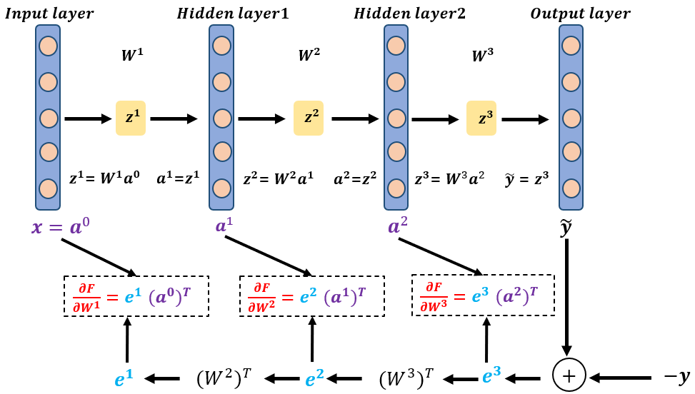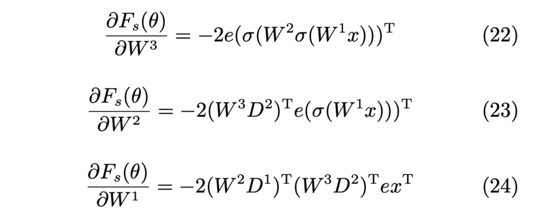 因为第一层是输入变量,不存在误差,有了所有的误差表达式之后,便可以计算各个层权重的偏导数为: