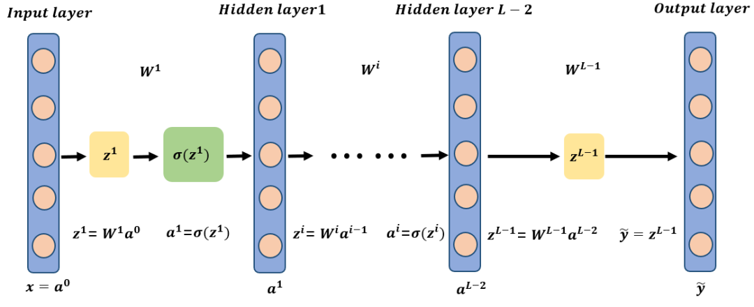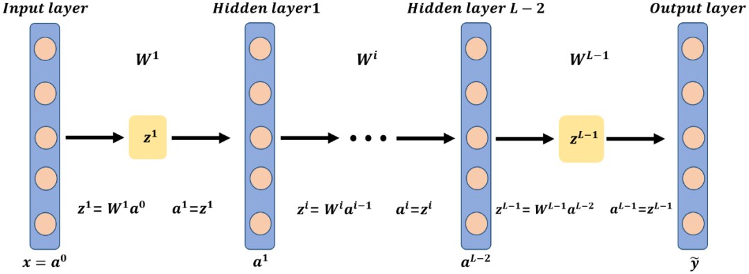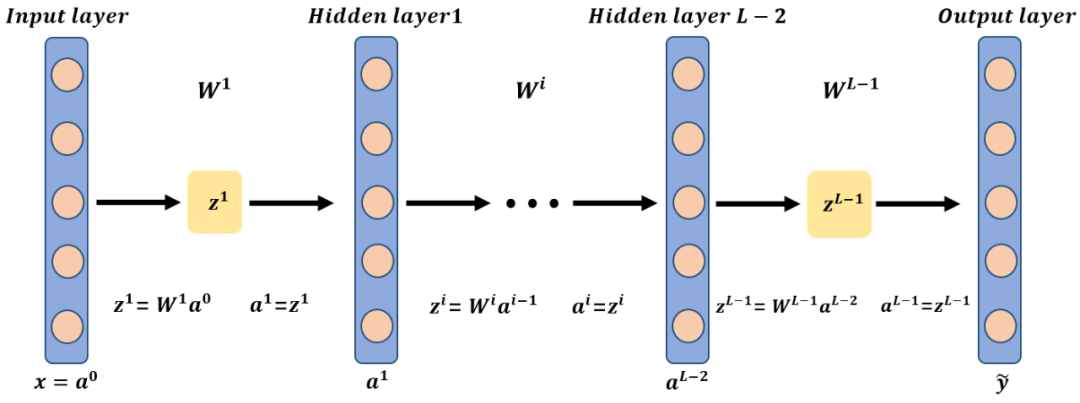 ▲ 图7:L层含激活函数的前向传播过程 图 7 表示的是 L 层含激活函数神经网络的前向传播过程,其中损失函数如下所示: