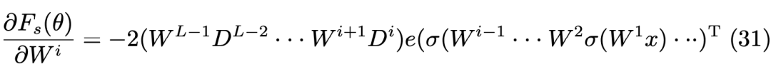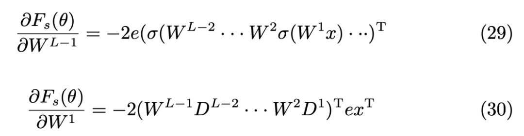 根据公式(25),(26),(27)将 4 层含激活函数的 BP 原理可以形象地表示为图 6,跟 section 4 中的 4 层无激活函数 BP 原理示意图的差异在于后向传播的误差信息需要多乘一个对角矩阵 。 ▲ 图6:4层含激活函数的BP原理图 L 层含激活函数的神经网络