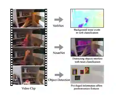 目标检测的结果能够与动作进行交互,从检测结果中判断一个人正在进行的事情。比方说,检测出一个菜刀与案板,旁边放着一条黄瓜,那么就可以识别出当下的动作是:在切黄瓜。通过关注视频的整体特征,检测出来的目标增强了模型进行判断的可靠程度,因此提升了识别的性能。