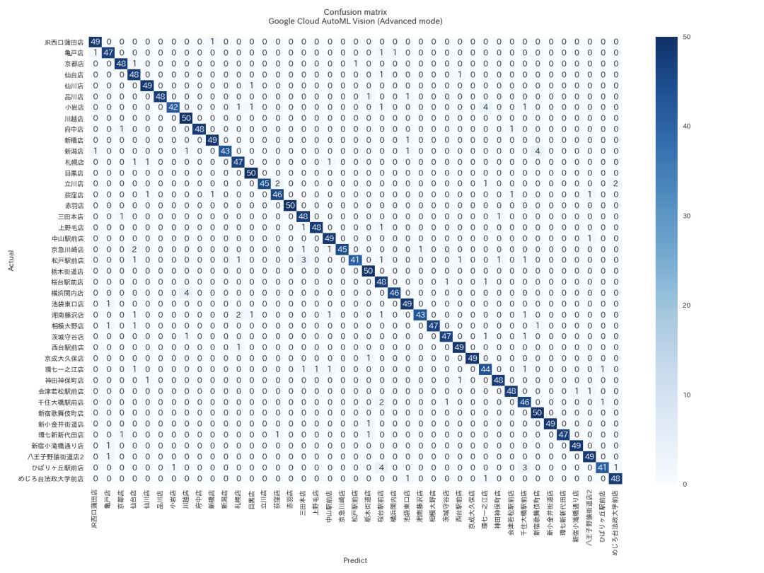 使用AutoML Vision(高级模式)的拉面店分类器的混淆矩阵