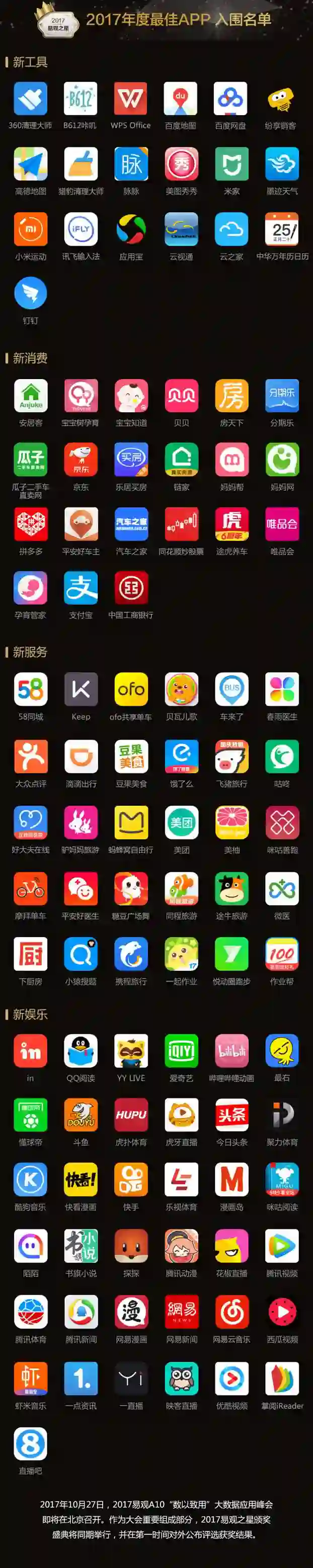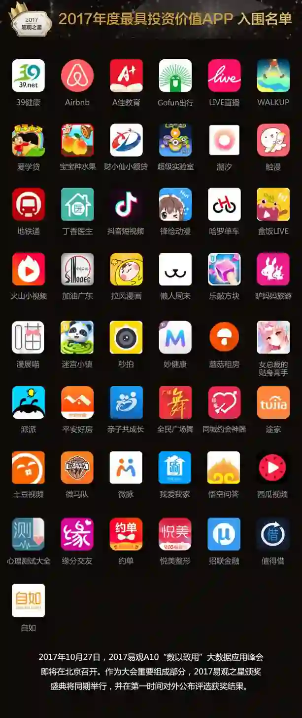 2017移动App风云论剑,谁才是流量和口碑之王?最具投资价值App又将被谁摘夺?“数据奥斯卡”易观之星评选,现已拉开帷幕,颁奖盛典及最终获奖名单将于2017年10月27日同期举行的易观A10峰会上揭晓。
