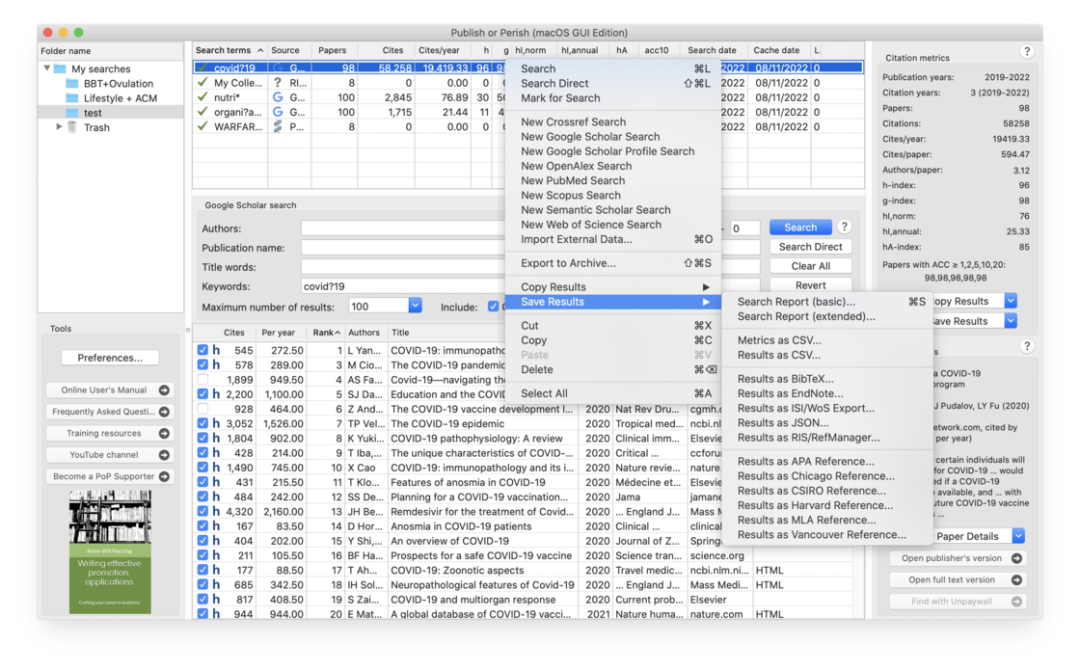 选择某一条检索,或者一个特定文章结果,右键打开菜单,选择「Save Results」,即可导出。Publish or Perish 支持常见的各种文献管理格式,包括但不限于 CSV、BibTeX 和 RIS。也可以选择将其导出为某个引用格式,生成的文件就会是写好的引文格式。