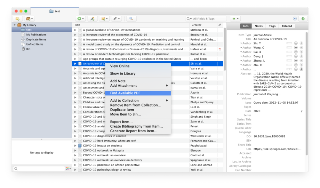 用 Zotero 打开 PoP 导出的 RIS 文件,选择导入位置,就可以把文章列表加入到数据库中。不过这么操作加入的只会是文献条目,需要右键「查找可用的pdf」才会自动下载文献对应的 PDF 文件。