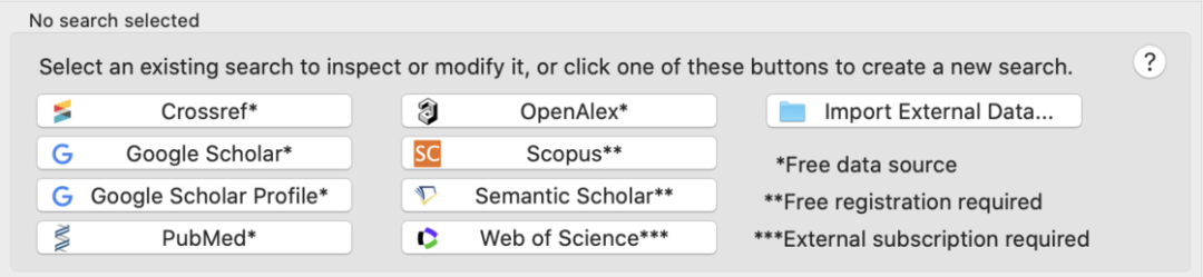 Publish or Perish 主界面最中心的部分就是选择检索文章的来源。它包括了最常用的几个文献库,如 Google Scholar、PubMed、Scopus 及 Web of Science。当然,用户也可以点击「Import」,导入已有的搜索结果。