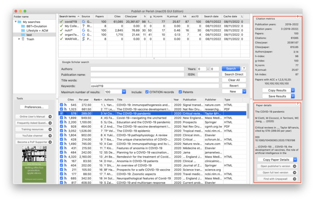 或许正是被这句死亡格言所启发,英国学者 Anne-Wil Harzing 在找教职失败后开发了一款同名软件 Publish or Perish(简称 PoP,下同)整合文献数据库的搜索结果、文章引用数据、学术影响力等信息,用以辅助自己的学术生涯。