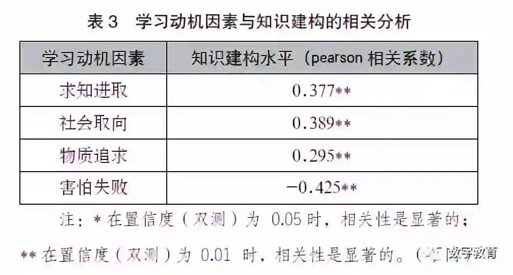 为了解学习动机对知识建构水平的影响,对学习动机因素与知识建构水平进行相关分析(表3 所示)。学习动机因素与学习者知识建构水平有一定相关性。