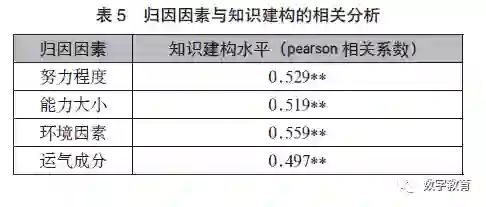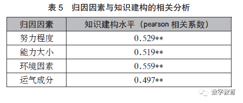 为了解学习者的归因因素对学习者知识建构水平的影响,对归因因素与知识建构水平进行相关分析(表5 所示)。归因与知识建构水平有一定相关性。努力程度、能力大小、环境因素、运气成分均与学习者知识建构水平呈正相关。