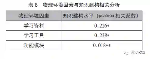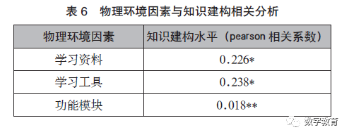 为了解社区物理环境因素与学习者知识建构水平的相关性,对社区物理环境因素的三方面与学习者知识建构水平进行相关分析(表6 所示)。物理环境因素与知识建构水平显著相关。学习资料、学习工具和功能模块设计均与知识建构水平呈正相关。