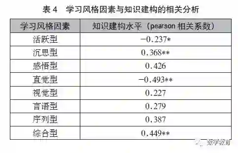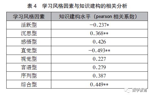 为深入研究学习者的学习风格对知识建构水平的影响,对学习风格与知识建构水平进行相关分析(表4 所示)。学习风格因素与学习者知识建构水平有较大相关性。沉思型、感悟型与学习者知识建构水平呈正相关,活跃型、直觉型与学习者知识建构水平呈负相关关系。后两对学习风格均与学习者知识建构水平呈正相关。