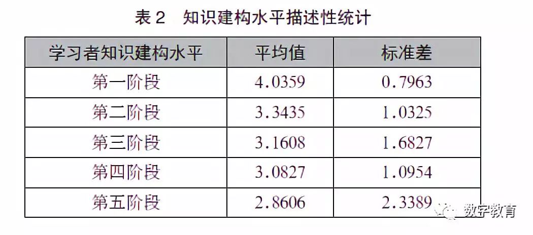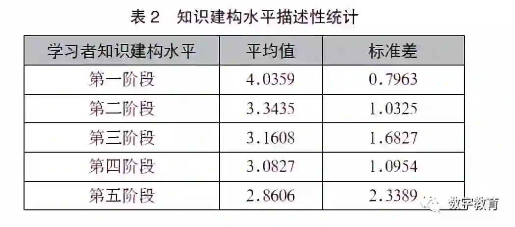 从表2 能够看出,除了第五阶段平均得分低于中间值3,其他问题的得分均高于中间值3,说明学习者在知识建构的意义达成阶段有一定难度,将新建构的知识付诸实践的过程中有困难。除了第一阶段平均得分超过4,其他问题平均得分均接近中间值3,说明学习者知识建构水平不是很高。