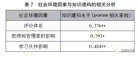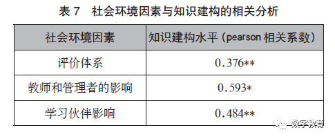 为了进一步确定社区社会环境因素与知识建构水平的相关性,对社区社会环境因素与知识建构水平进行相关分析(表7 所示)。由表7 可知,社会环境因素与知识建构水平显著相关。