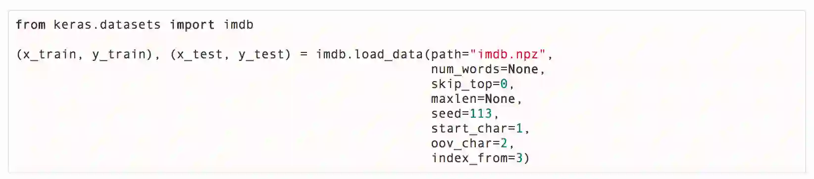 2. 当 Keras 已安装完毕,则 IMDB 可由此方式入手 (https://keras.io/datasets/)。此 API 的底层:https://github.com/fchollet/keras/blob/master/keras/datasets/imdb.py