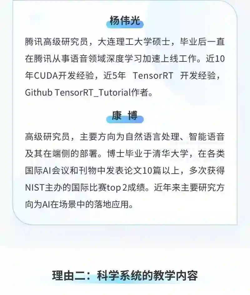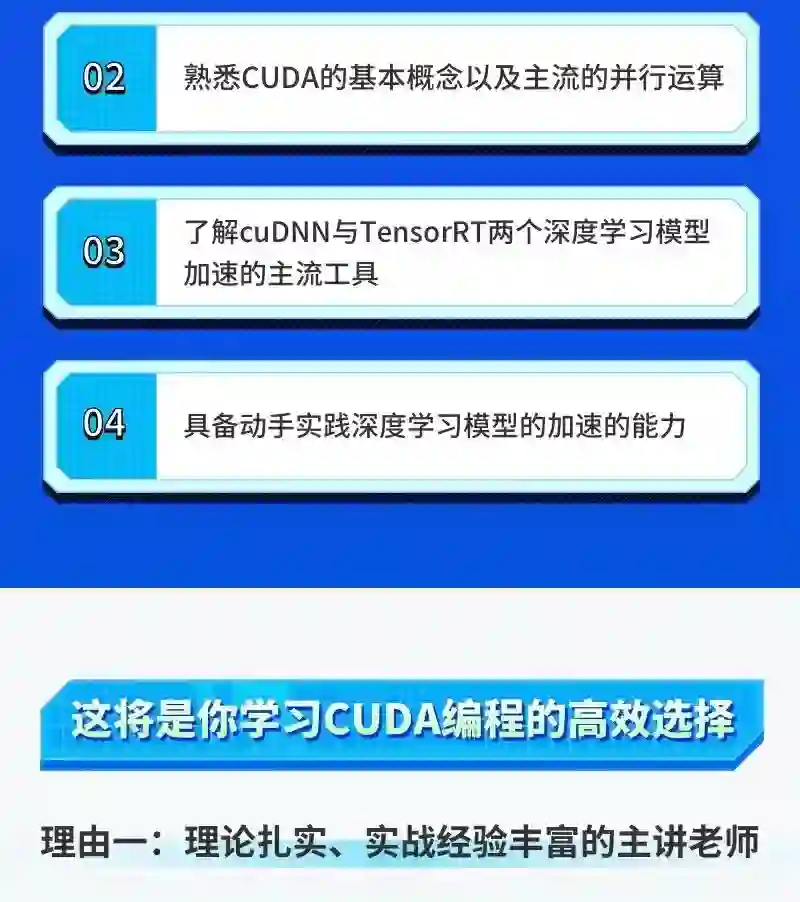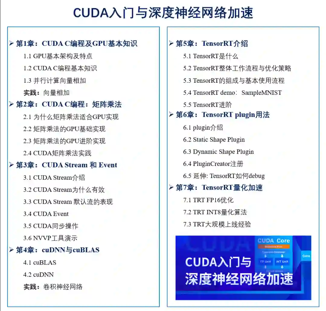 希望大家通过这门课程的学习,能够具备 CUDA 编程操作能力,使用 cuDNN 、 TensorRT 这两个当下热门的深度神经网络加速工具。