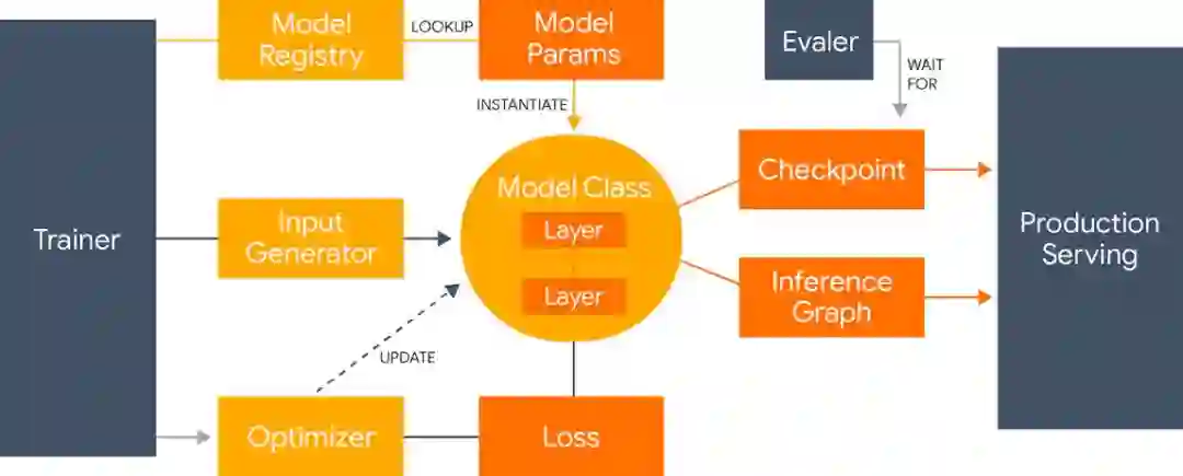 图 1:Lingvo 框架整体结构,它展示了模型如何进行实例化、训练、评估和部署。