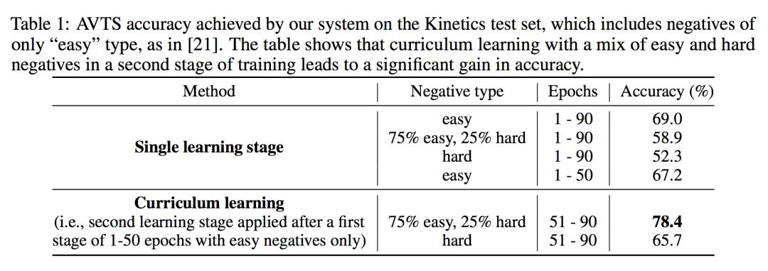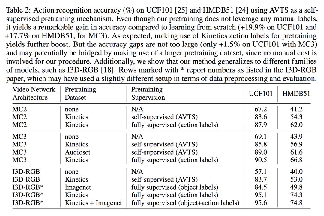 在评估视觉特征性能时,正如预期的那样,使用动作类标签对 Kinetics 数据集进行预训练可以提高 UCF101 和 HDMB51 的准确度。但是,这会占用 500K 视频剪辑上手动标记的巨大成本。相反,AVTS 预训练是自监督的,因此它可以应用于更大的数据集而无需额外的人工成本。