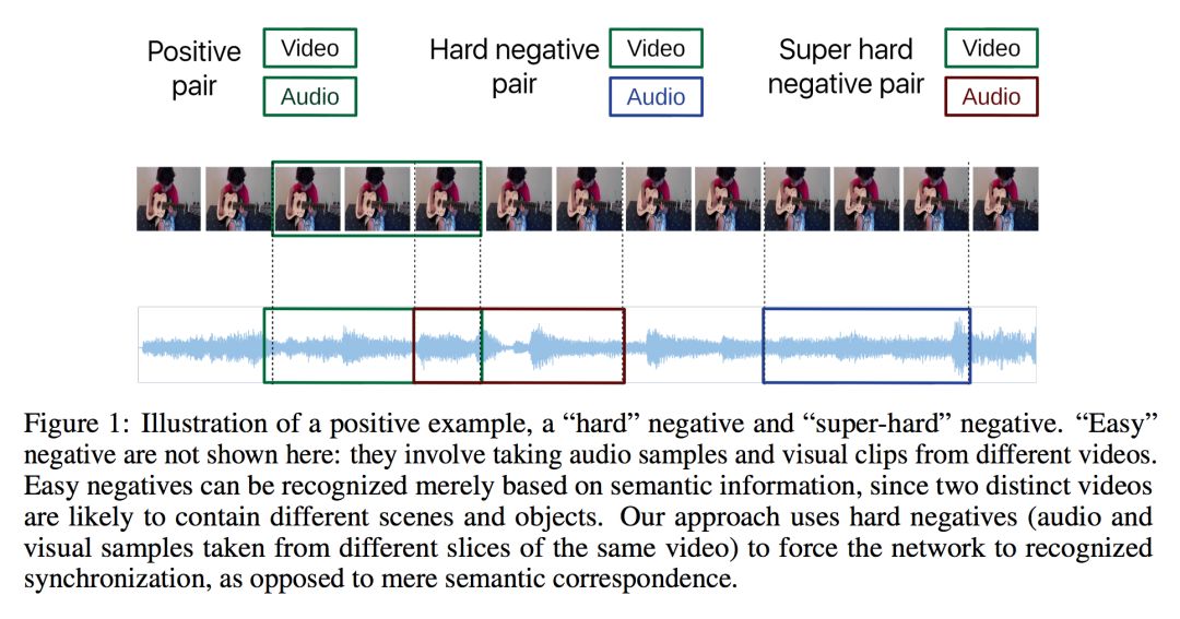 训练集选择同一视频下时序对应的视频和音频为同步的正例,对于负例,定义不同视频下视频和音频为简单负例,同一视频下时序不同步的为硬(“hard”)负例,硬负例下时序相差太远的定义为超硬负例,我们由下图可以进一步理解正负例定义原则。