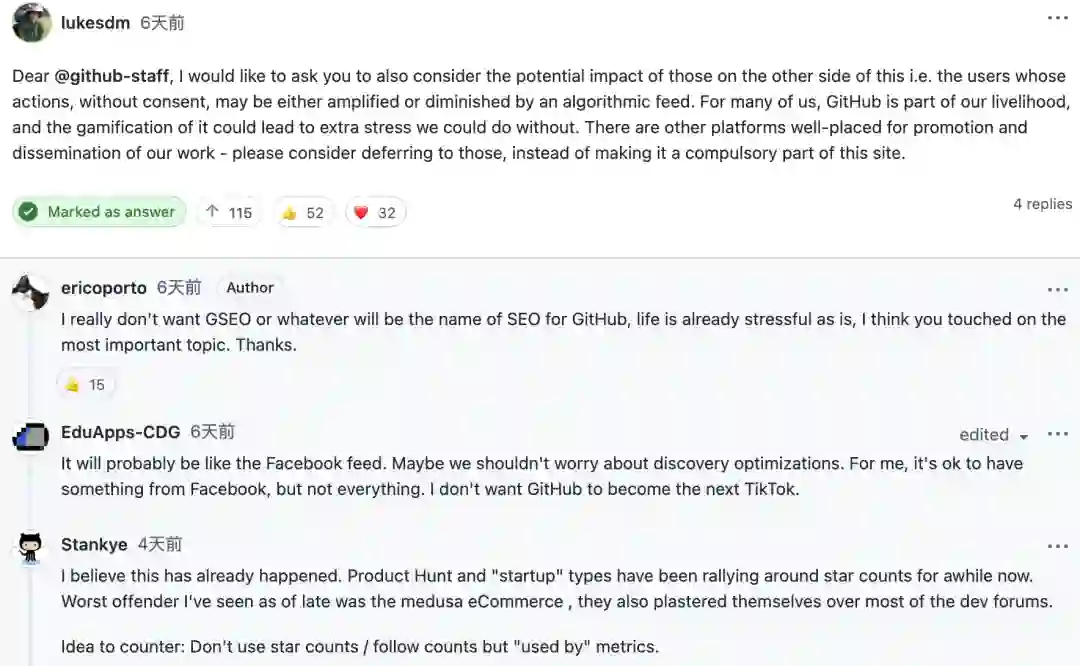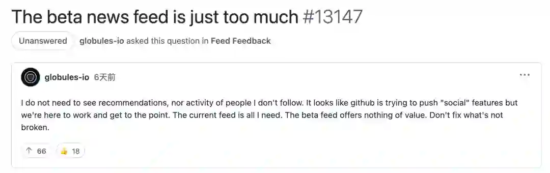 还有不少开发者直言不讳,“我不需要看到推荐,也不需要看到我不关注的人的活动,GitHub 正在试图推出社交功能,但我们在这里是为了工作”、“请不要把 GitHub 变成 Facebook”、“请给我一个选项来完全禁用算法提要”。