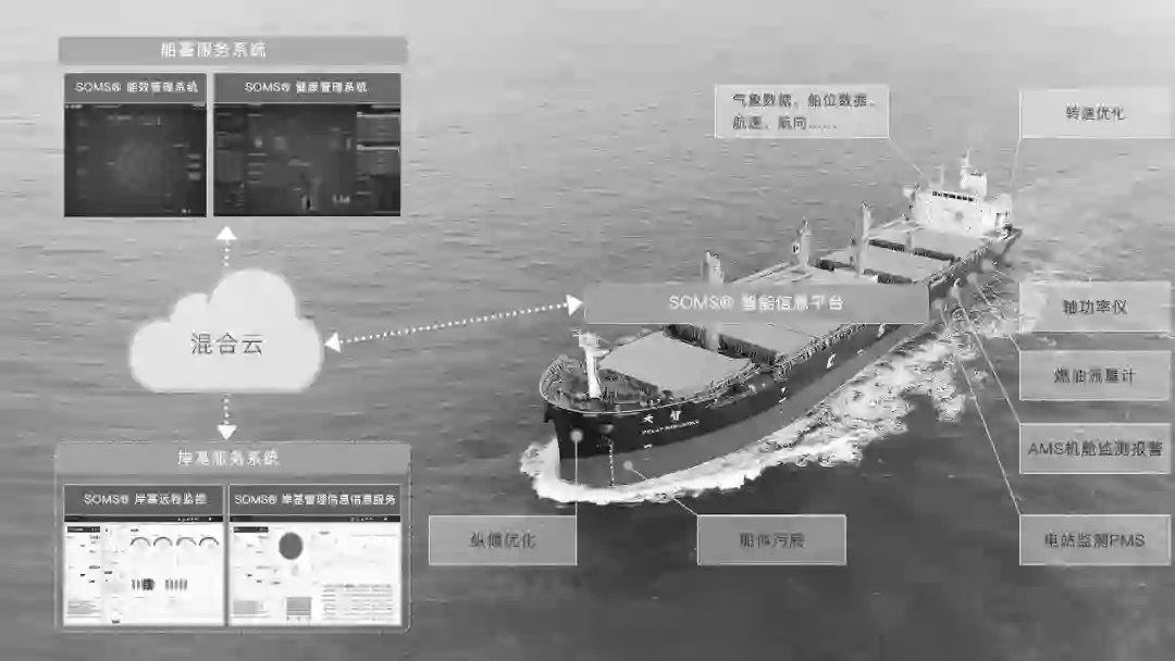 SOMS系统的架构可以概括为 “两端 + 一网 + 两云” , 即自主控制端、智能管理端、工业传输网络和 “本地云 + 远程云” 的混合云平台四部分, 涵盖了CPS状态感知、实时分析、科学决策、精准执行四个过程。在2017年中国船舶工业集团公司发布的全球首艘经船级社认证的智能船舶 “大智号” 中, SOMS系统的架构应用部署图如图3所示, SOMS系统通过了英国劳氏船级社和中国船级社的双认证, 成为全球首套同时满足中国船级社智能船舶规范智能能效E、智能机舱M、智能集成平台I符号以及英国劳氏船级社Cyber-enabled ship智能船舶规范中Cyber SAFE, Cyber MAINTAIN, Cyber PERFORM符号要求系统的民用智能船舶系统产品。自主控制端借助感知与自动控制技术实现个体、群体、环境、活动等多目标数据的感知与获取以及对设备、系统、单船与船队的自动控制。云平台借助工业云技术, 采用“本地云 + 远程云”的混合云架构既保证了本地计算的实时性、隐私性与安全性, 又保证了远程计算的共享性、协同性与高效性。智能管理端面向设备、系统、单船和船队故障预测、健康管理、能效优化和辅助决策等需求, 搭建了智能服务平台。自主控制端、智能管理端和混合云平台通过工业网络和工业软件技术形成数据驱动的CPS闭环赋能体系。
