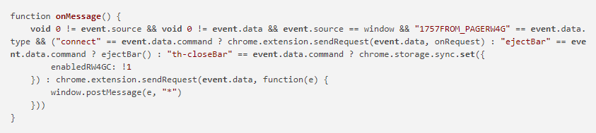 在 “inject.js” 脚本文件中,存在一个事件监听函数addEventListener,任何被插入 “inject.js” 脚本文件的交互网页,如果以“postMessage”方式向插件发送响应消息,都能被该函数捕获到: