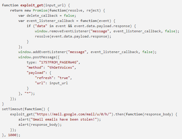 上述Payload代码显示,可以利用该漏洞去读取跨域响应信息。这种情况下,我们用Gmail的 “Simple HTML”服务 来作示例。整个的漏洞利用方法就比较简单直接了:把上面这个Payload代码托管在任意网站上,安装了存在该漏洞的Read&Write插件用户,只要登录进入Gmail邮箱,我就可以用上述Payload来读取到用户的相关Gmail邮箱内信息。整个过程是通过之前我们说明的,以恰当的Payload设置形成postMessage消息,并结合消息响应的事件监听方式来实现的。由于Read&Write插件会向所有HTTP和HTTPS的Web页面执行应用插入,所以,在 JavaScript Promises 异步编程方式下,可以通过“exploit_get()”函数能窃取到用户经过认证的任意访问过的页面数据信息(这里假设无需特殊Header标头,能通过HTTP GET方式进行访问的页面)
