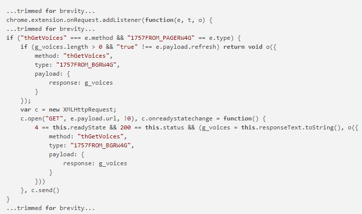 上述代码显示,“chrome.extension.onRequest” .addListener监听器被触发时,其内部的“method” 参数会被设置成“thGetVoices”,“type”参数则被设置为“1757FROM_PAGERW4G”。如果这个触发事件中的“payload.refresh”参数为“true” ,则其中的XMLHTTPRequest会被请求响应为代号为200的状态码。