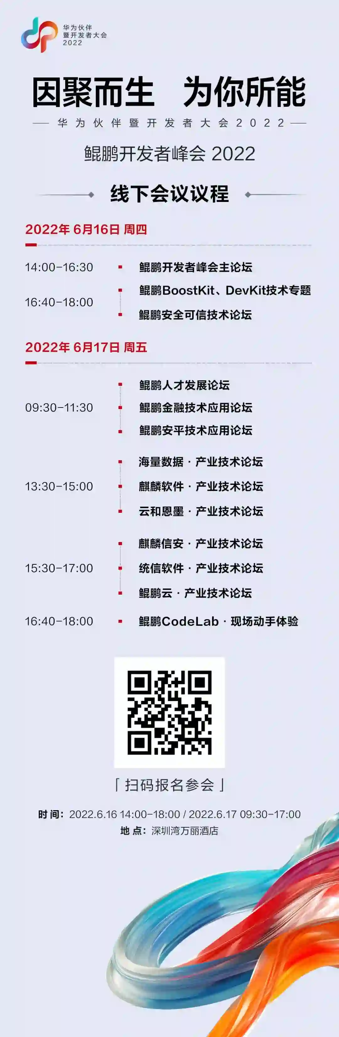 鲲鹏开发者峰会主论坛 2022 将于 6 月 16 日下午 14:00 正式开幕,线上报名通道现已开启,感兴趣的小伙伴可扫描下方海报二维码或点击阅读原文提前预约!