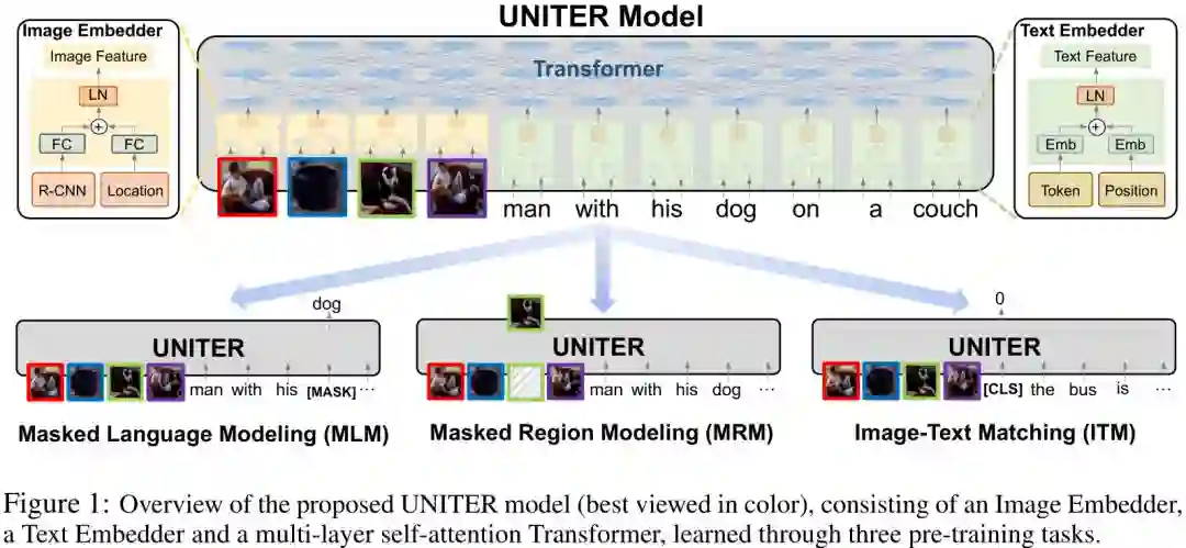 为了解决这个问题,我们引入了通用的图像-文本表示(UNITER),这是一种大规模的多模态嵌入的预训练模型。我们采用Transformer作为我们模型的核心,利用其简洁的自我注意力机制,设计学习协同文本的表示。受BERT 的启发,通过大规模的语言建模成功地将Transformer应用于NLP任务,我们通过三个预处理任务对UNITER进行预处理:(i)基于图像的掩码语言建模(MLM);(ii)基于文本的掩码区域建模(MRM);(三)图像文本联合匹配(ITM)。为了进一步研究MRM的有效性,我们提出了三种MRM变体:(i)掩码区域分类(MRC);(ii)掩码区域特征回归(MRFR);(iii)用KL散度(MRC-KL)掩码区域分类。