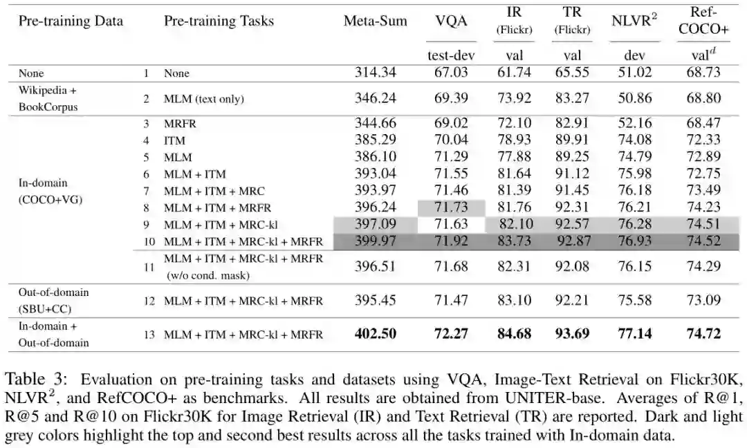 其次,我们通过一个完全的消融研究来验证每个预训练任务的有效性。比较L2和L3, MRFR (L3)只在NLVR 2上比MLM (L2)取得更好的结果。另一方面,当只接受ITM (L4)或MLM (L5)的预训练时,我们观察到L1和L2基线上所有任务的显著改善。当结合不同的预训练任务时,MLM + ITM (L6)在单一ITM (L4)或MLM (L5)的基础上进行了改进。当 MLM,ITM和MRM共同训练(L7-L10),我们在所有基准测试中都观察到一致的性能提升。在MRM (L7-L9)的三种变体中,我们观察到,当与MLM + ITM相结合时,MRC-KL (L9)表现最好(397.09),而MRC (L7)表现最差(393.97)。当结合MRC-KL和MRFR与MLM和ITM (L10)时,我们发现它们是互补的,并获得最高的Meta-Sum得分。我们将此作为进一步实验的最佳预训练设置。