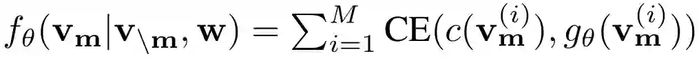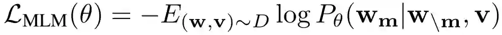掩码语言模型 (MLM) 我们将图像区域表示为v = {v_1,…, v_k},将输入单词表示为w = {w_1,…,w_T},掩码指数为m属于 N_M。在MLM中,我们随机掩码输入中15%的单词,用特殊的标记[MASK]代替w_m。目标是通过观察掩码单词的周围的单词w_\m和整个图像区域v,通过最小化负对数似然来预测这些掩码单词:
