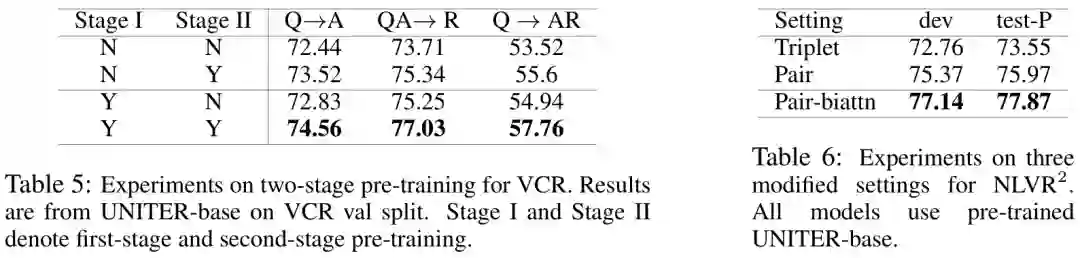 对于VCR,我们提出了两阶段的预训练方法:(i)在标准的预训练数据集进行预训练;然后(ii)对下游VCR数据集进行预训练。有趣的是,VLBERT和B2T2观察到,在VCR上,预训练不是很有帮助,我们发现,第二阶段的预训练可以显著提高模型的性能,而第一阶段的训练仍然有帮助(结果如表5所示)。这表明本文提出的两阶段方法在我们的预训练模型中是非常有效的,在预训练数据集中看不到的新数据。