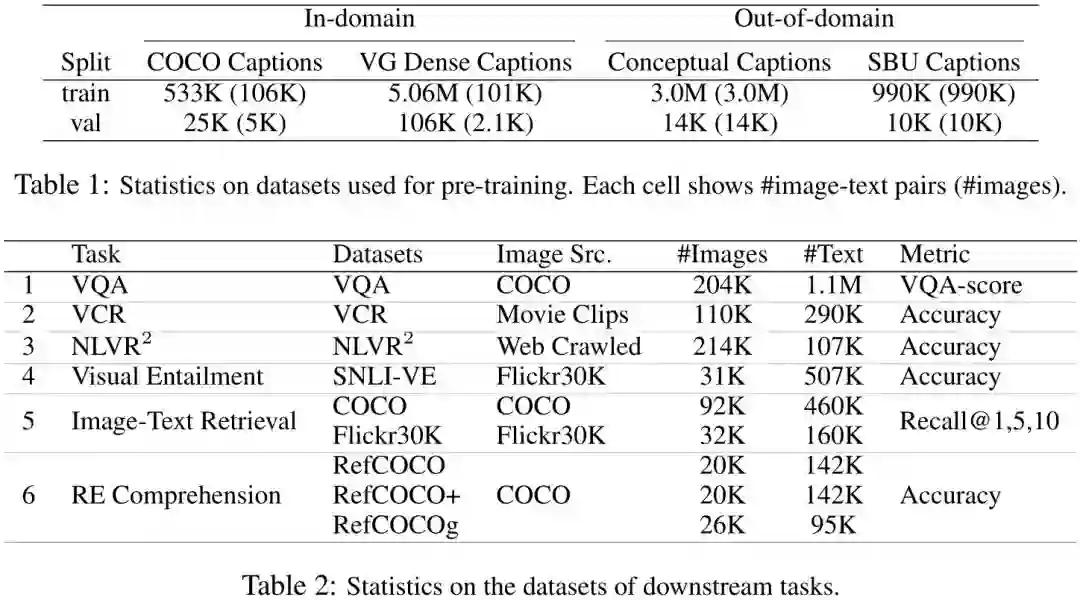 为了研究不同数据集对预训练的影响,我们将四个数据集分为两类。第一种是由来自COCO图像字幕数据和来自VG密集字幕数据。我们称之为“域内”数据,正如大多数V+L任务都是建立在这两个数据集之上的。为了获得一个“公平”的数据分割,我们合并来自COCO的原始训练集和验证分割集,并去掉下游任务中出现的所有验证和测试图像。我们还排除了所有的共发生通过URL匹配的Flickr30K图像,即COCO和Flickr30K图像来自Flickr,可能有重叠。同样的规则也适用于视觉基因组。通过这种方式,我们获得了5.6M对用于训练的图像-文本对,131K对用于训练的图像-文本对内部验证,由于只对重叠图像进行过滤和使用图像-文本对,所以只有LXMERT数据集大小的一半。我们也使用附加的领域外的数据来自概念字幕和SBU字幕用于模型训练。表1提供了清洗后的拆分的统计数据。