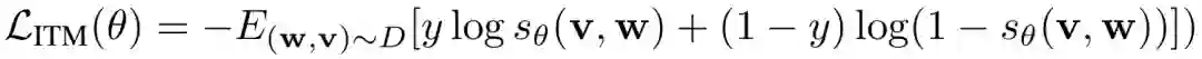 图像-文本匹配( ITM) 在ITM中,一个附加的特殊标记[CLS]要输入到我们的模型中,它表明了两种模式的融合表示。我们在[CLS]的Transformer输出上应用FC层,记录输入图像和文本之间的匹配程度。得分函数表示为sθ(w, v)。在训练过程中,我们在每一步都从数据集D中抽取一个正样本对或负样本对(w,v)作为样本。负样本对是通过将成对样本中的图像或文本替换为从其他样本中随机选择的一个来创建的。我们将标签表示为:y属于{0,1},表示采样对是否匹配。然后利用二元交叉熵损失进行优化: