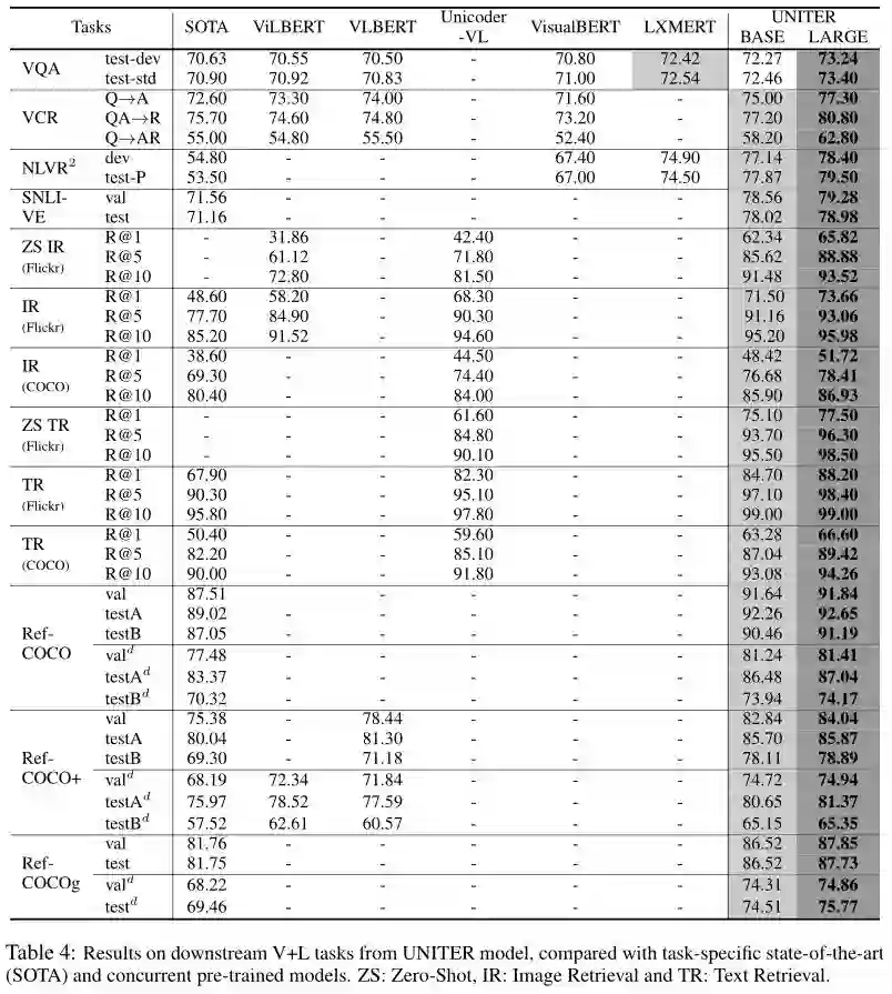 表4给出了UNITER对所有下游任务的结果。我们的基准和大型模型都是在域内+域外数据集上进行预训练,最佳的预训练设置是:MLM+ITM+MRC-kl+MRFR。每个任务的实现细节在附录A.2中提供。我们比较了每个下游任务的特定任务模型和并行预训练模型。SOTA任务特定模型包括:用于VQA的MCAN、用于NLVR 2的MaxEnt 、用于VCR的B2T2、用于图像文本检索的SCAN、用于SNLI-VE的EVE-Image和用于RE理解的MAttNet(RefCOCO, RefCOCO+和RefCOCOg)并行预训练模型包括:LXMERT, Unicoder-VL, VisualBERT和VLBERT。