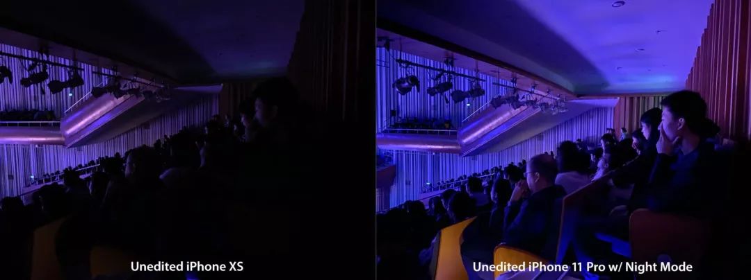 在上面的观众形象中,你会注意到夜间模式即使是在舞台上投下的暗蓝光中还能很好地保留了人物肤色的暖色调。这一点令人印象深刻——在某些情况下,iPhone 11 Pro 在我们用肉眼看不到的低光场景中拍到了容易忽略的色彩。