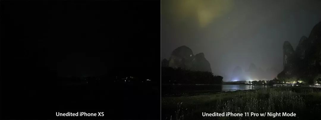 iPhone XS 与 iPhone 11 Pro 夜间模式,三脚架拍摄,中国桂林