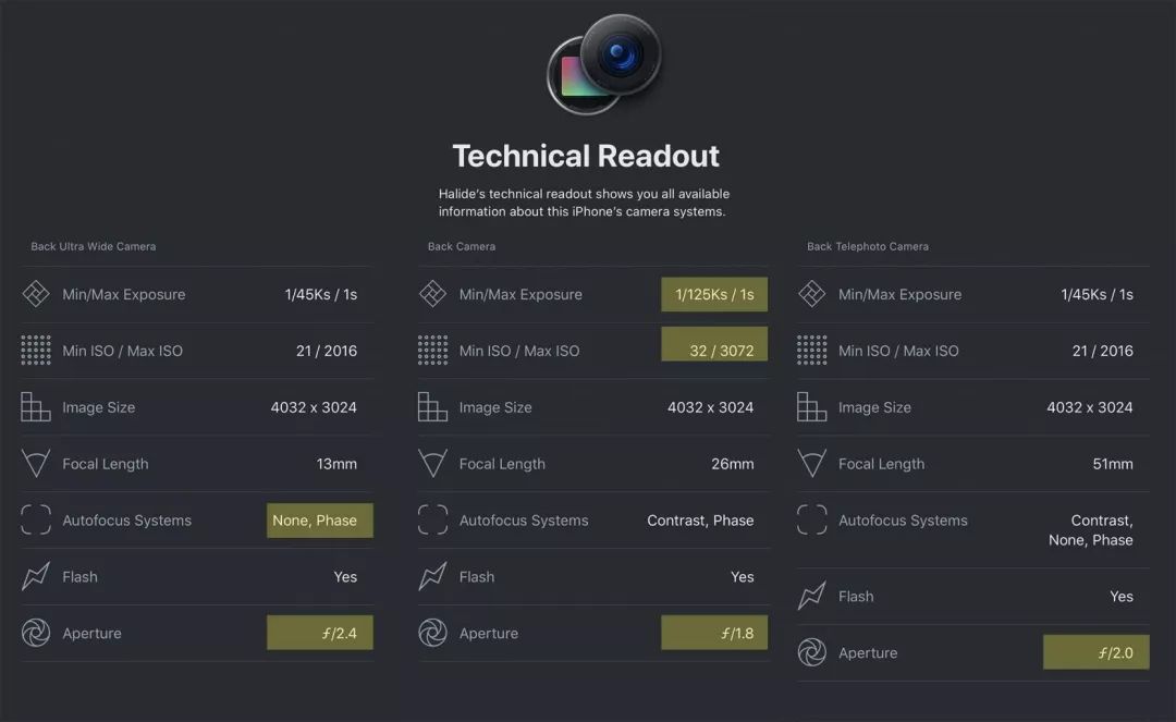 正如我们在 Halide 应用(该应用开发者也刚刚用它来分析了 iPhone 11 相机系统)的技术读数工具中看到的那样,iPhone 11 最强的镜头是主镜头,也就是广角镜头:它的快门范围为 1/125,000 到 1 秒,拥有最大光圈和最高的 ISO。夜间模式和自动对焦系统也由它提供。